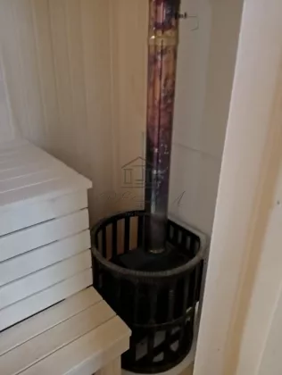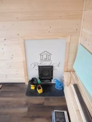 Внутренняя отделка в парной из липы, душевой и комнаты для отдыха из сосны. На пол уложен влагостойкий ламинат. Печь ВЕЗУВИЙ Легенда Ковка 16 (271) (для парных объемом парного помещения от 8 до 18 куб.м). Дополнительно, специально для печи смонтированы 2 сваи.