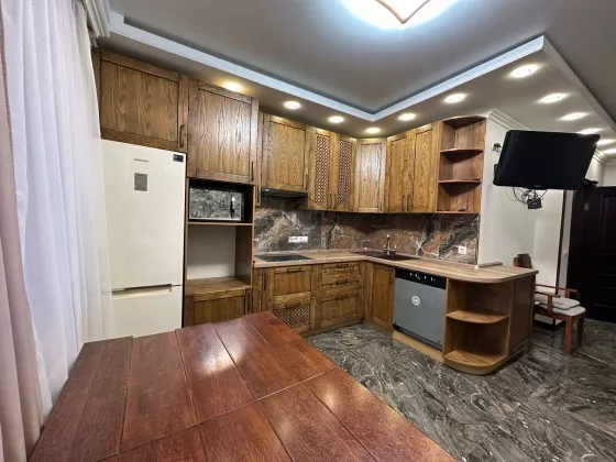 Большим бонусом является кухня гостиная 16 кв. м, где уютно может разместиться вся большая семья! Кухонный гарнитур изготовлен из массива дуба. Так же в кухне стоит большой раздвижной диван.